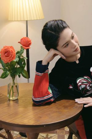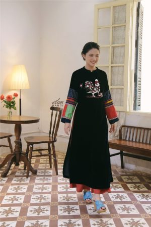 Áo dài nhung the phối thổ cẩm thêu tay tranh Đông Hồ