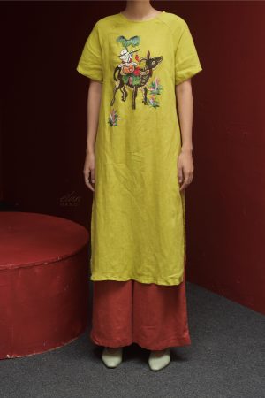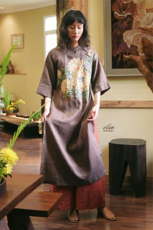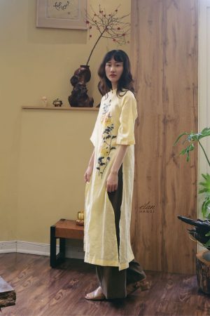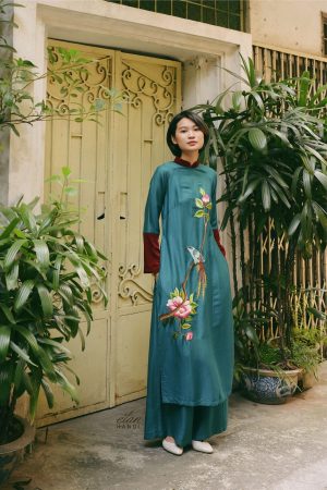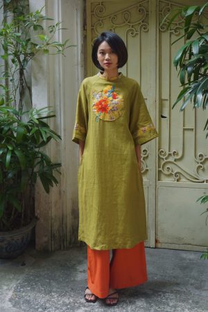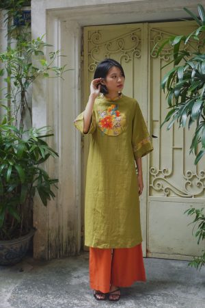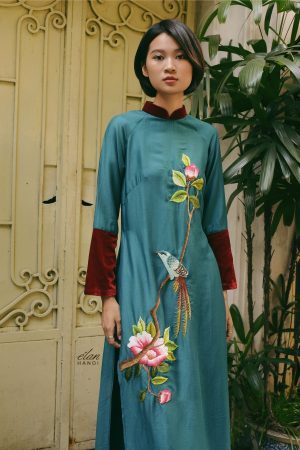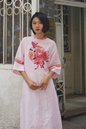 Áo dài hồng đáp vải thêu tay hoa cúc đỏ