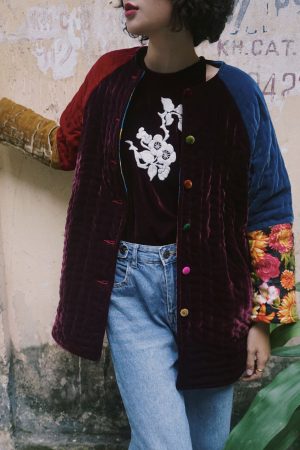Áo khoác nhung the bông chần tay phối vải hoạ tiết