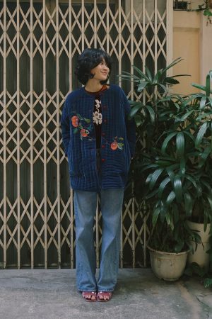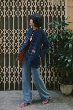 Áo khoác nhung the chần bông tay thêu tay cúc mi