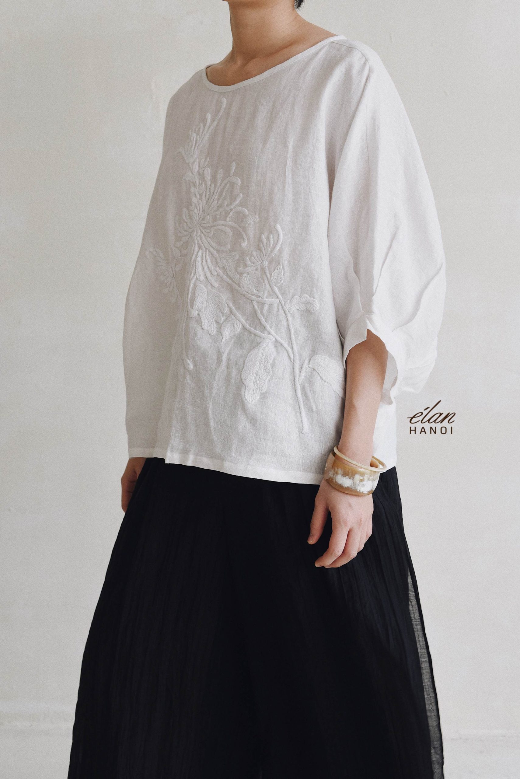 Áo sơ mi thêu tay cụm hoa cúc rơi